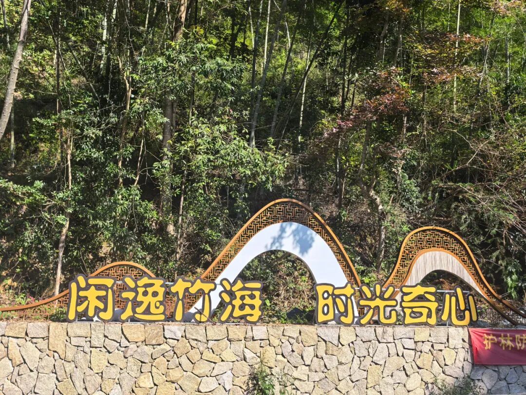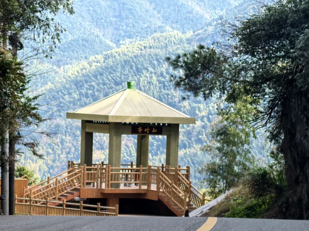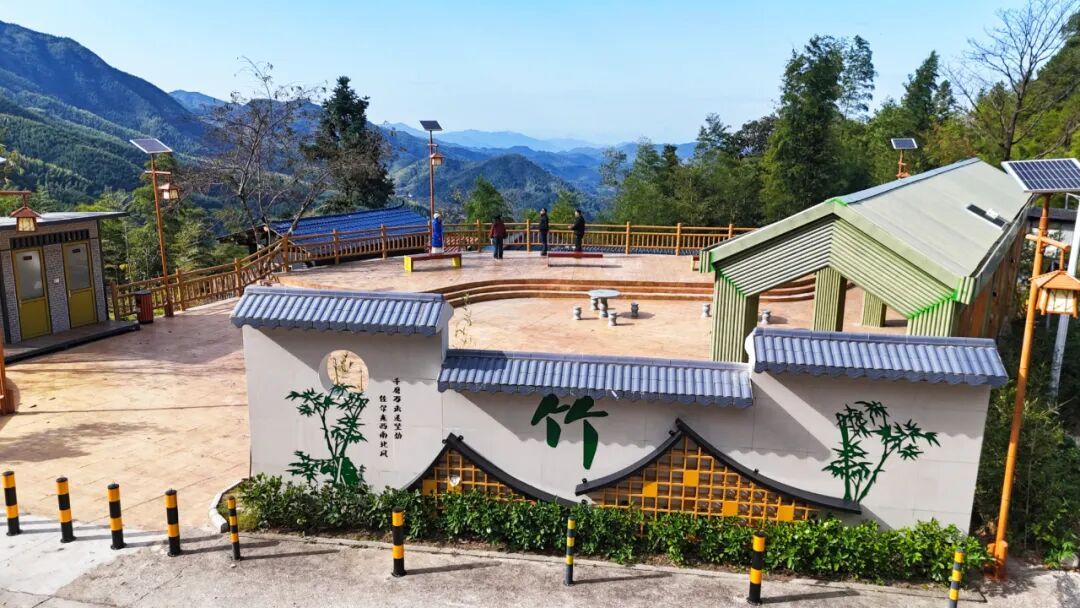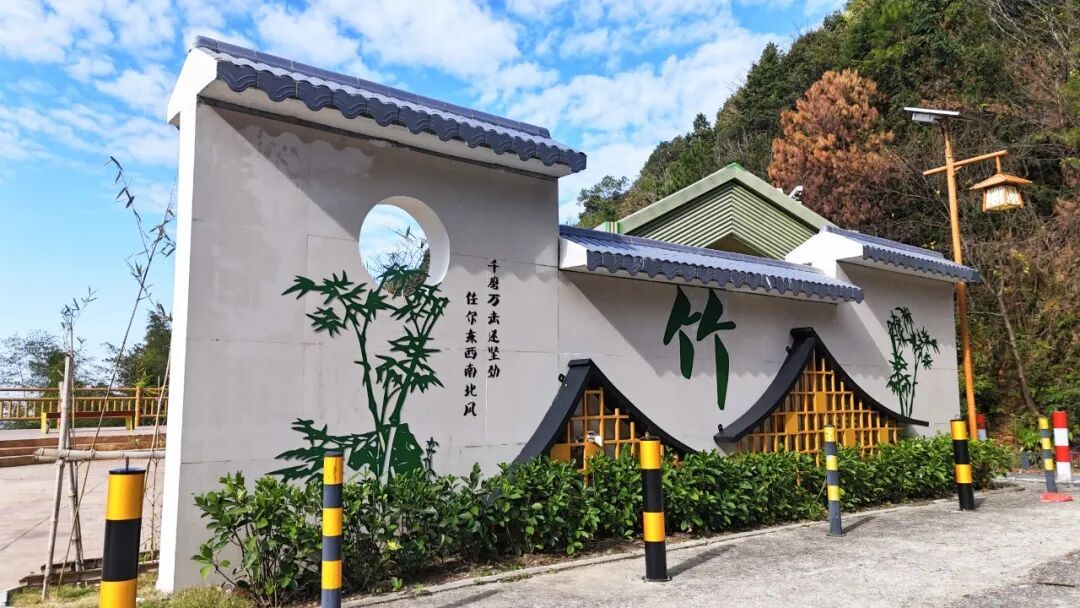 这座观景台,仿竹纹理的亭柱栏杆质朴自然,长廊墙面上的墨竹图与咏竹诗词意境悠远,每一处细节都紧扣“竹”主题,将奇心村“毛竹之乡”的底蕴娓娓道来,生动诠释着设计与自然和谐共生的独特魅力。
